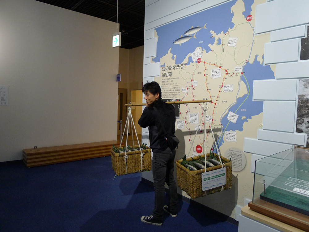 体験コーナーでは昔、鯖を運んだ桶が担げます