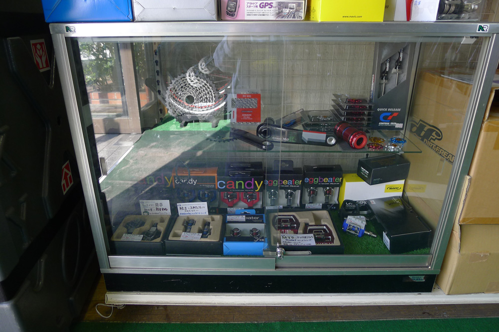 ショーケースにはスラムXX1とクランクブラザーズのペダルが